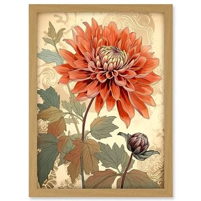 Artery8 Pastel Colour Orange Dahlia Flower with Patterns Artwork Framed A3 Wall Art Print