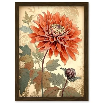 Artery8 Pastel Colour Orange Dahlia Flower with Patterns Artwork Framed Wall Art Print A4