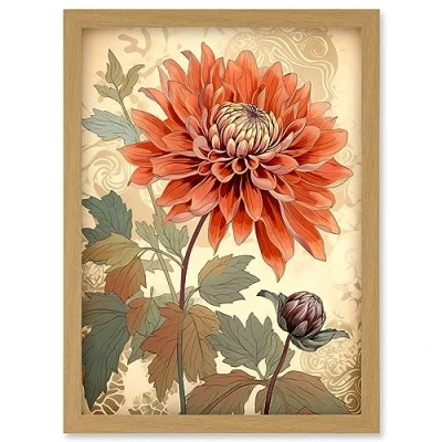 Artery8 Pastel Colour Orange Dahlia Flower with Patterns Artwork Framed Wall Art Print A4