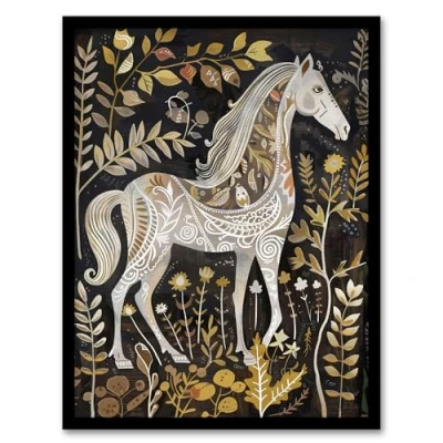Artery8 Patterned Horse Woodland Forest Rustic Folk Art Living Room Artwork Framed Wall Print A4