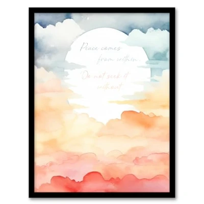 Artery8 Peace Comes From Within Buddhist Mindfulness Quote Watercolour Sun Through Clouds Buddha Meditation Enlightenment Vihara Artwork Framed Wall Art Print 18X24 Inch
