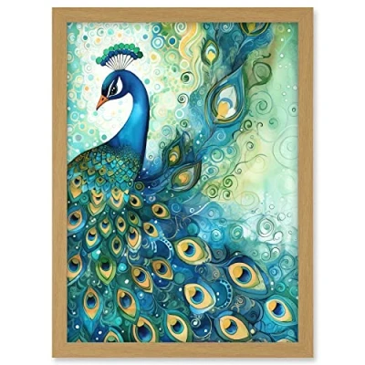 Artery8 Peacock Bird Concept Folk Art Watercolour Painting Artwork Framed A3 Wall Print