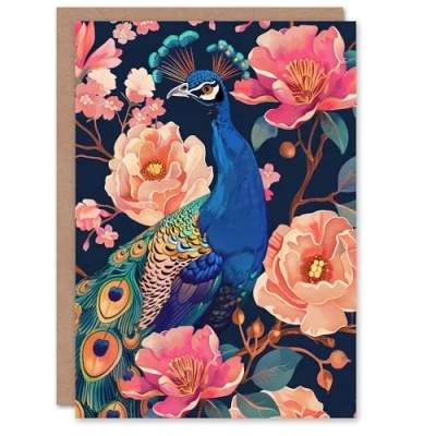 Artery8 Peacock Bird with Pink Flower Pattern Design Greeting Birthday Card Him Her All Blank