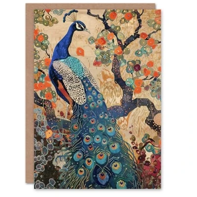 Artery8 Peacock in Tree with Wildflowers Artwork Detailed Greeting Birthday Card Him Her All Blank