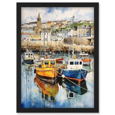 Artery8 Penzance Harbour Trawler Boats Promenade Watercolour Painting Cornwall Coastal Townscape Artwork Framed Wall Art Print A4