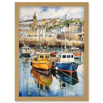 Artery8 Penzance Harbour Trawler Boats Promenade Watercolour Painting Cornwall Coastal Townscape Artwork Framed Wall Art Print A4