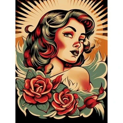 Artery8 Pin Up Girl Roses Retro Tattoo Ink Body Art Rockabilly Americana 50s Large Wall Poster Print Thick Paper 18X24 Inch