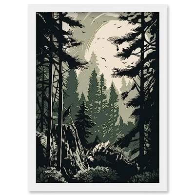 Artery8 Pine Tree Forest Sunrise Landscape Illustration Artwork Framed Wall Art Print A4