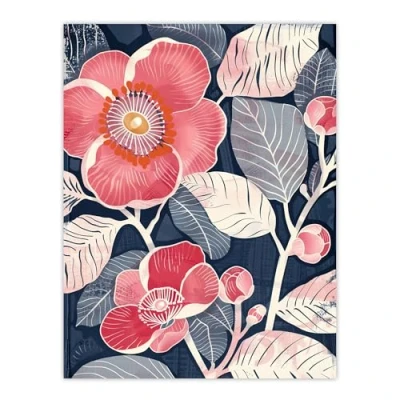 Artery8 Pink Camellia Flowers Blue Foliage Artwork Floral Living Room Extra Large XL Wall Art Poster Print