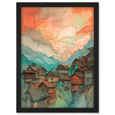 Artery8 Pink Dawn Atmospheric Clouds Over Small Mountain Village in the Alps Modern Watercolour Painting Artwork Framed A3 Wall Art Print