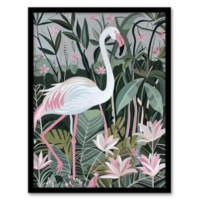 Artery8 Pink Flamingo Lilies Leaves Artwork Tropical Living Room Framed Wall Art Print A4