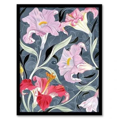 Artery8 Pink Lily Flowers Stylised Detailed Floral Living Room Artwork Framed Wall Art Print A4