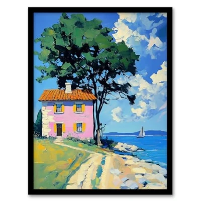 Artery8 Pink Village Cottage Coastal Greece Landscape Living Room Artwork Framed Wall Art Print A4