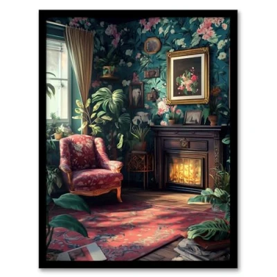 Artery8 Plant Lover Cozy Fireplace Floral Tapestry Living Room Artwork Framed Wall Art Print A4
