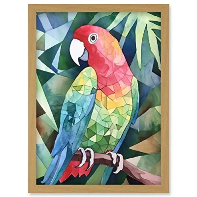 Artery8 Polygon Parrot Bird On Tree Branch Watercolour Painting Artwork Framed Wall Art Print A4