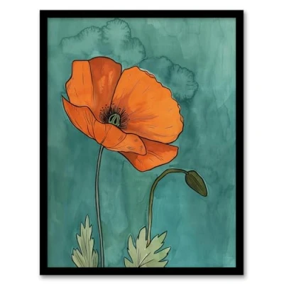 Artery8 Poppy Flower Bloom Teal Orange Floral Watercolour Living Room Artwork Framed Wall Art Print A4
