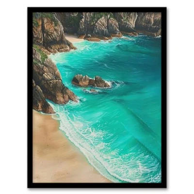 Artery8 Porthcurno Beach Cliffs Aerial View Landscape Living Room Artwork Framed Wall Art Print A4