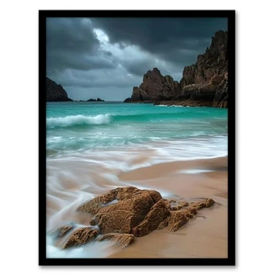 Artery8 Porthcurno Beach Cliffs Dramatic Landscape Living Room Artwork Framed Wall Art Print A4