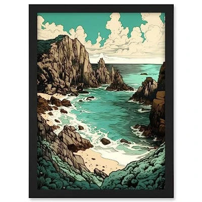 Artery8 Porthcurno Granite Cliff Beach Coastal Landscape Artwork Framed A3 Wall Art Print