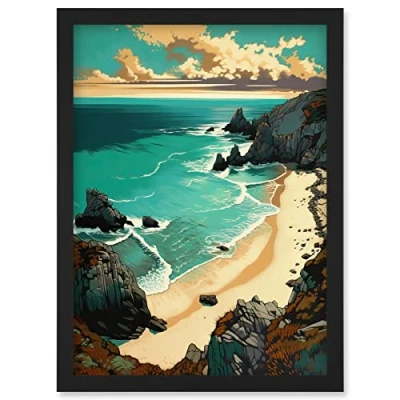 Artery8 Porthcurno Sandy Beach Cliffs Coastal Landscape Artwork Framed Wall Art Print A4