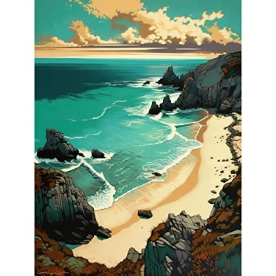 Artery8 Porthcurno Sandy Beach Cliffs Coastal Landscape Extra Large XL Wall Art Poster Print