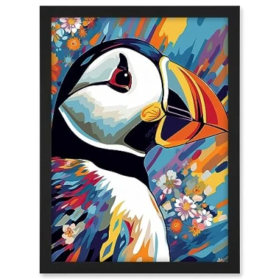 Artery8 Puffin and Flowers Acrylic Paint Vibrant Colour Brushes Psychedelic Sea Bird Artwork Framed A3 Wall Art Print