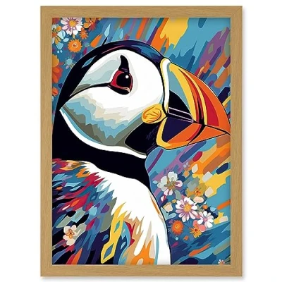 Artery8 Puffin and Flowers Acrylic Paint Vibrant Colour Brushes Psychedelic Sea Bird Artwork Framed Wall Art Print A4