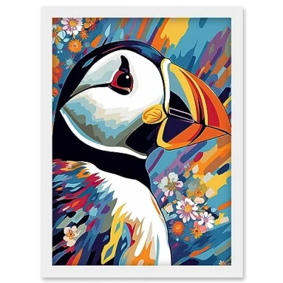 Artery8 Puffin and Flowers Acrylic Paint Vibrant Colour Brushes Psychedelic Sea Bird Artwork Framed Wall Art Print A4