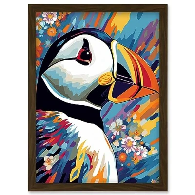 Artery8 Puffin and Flowers Acrylic Paint Vibrant Colour Brushes Psychedelic Sea Bird Artwork Framed Wall Art Print A4