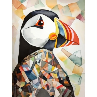 Artery8 Puffin Bird Abstract Portrait Folk Art Extra Large XL Wall Poster Print