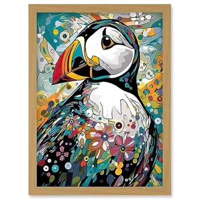Artery8 Puffin Bird Acrylic Painting Floral Psychedelic Aquatic Colourful Flowers Artwork Framed Wall Art Print A4
