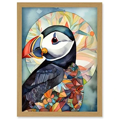 Artery8 Puffin Bird Portrait Folk Art Artwork Framed Wall Print A4