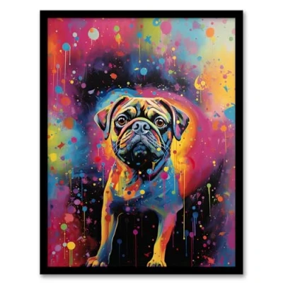 Artery8 Pug Dog Lover Gift Pet Portrait Colourful Neon Artwork Painting Framed Wall Art Print A4