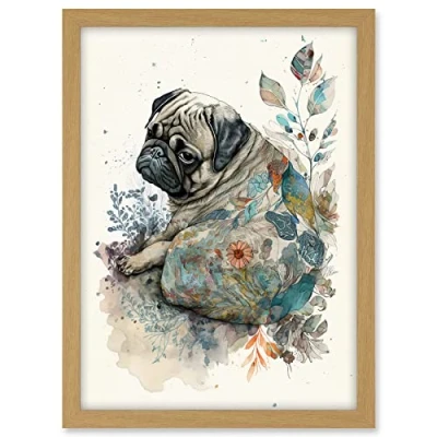 Artery8 Pug Dog with Floral Pattern Modern Multicoloured Watercolour Illustration Artwork Framed A3 Wall Art Print