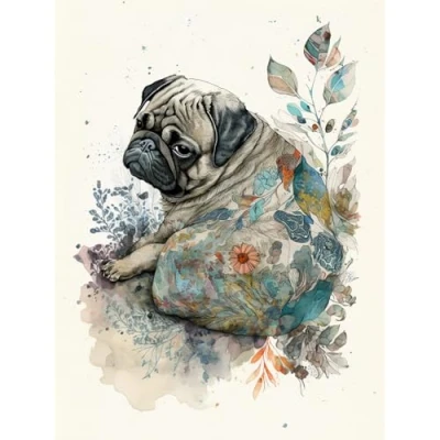 Artery8 Pug Dog with Floral Pattern Modern Multicoloured Watercolour Illustration Extra Large XL Wall Art Poster Print