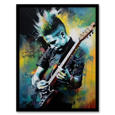 Artery8 Punk Music Artwork Blue Yellow Guitarist Playing At Concert Vibrant Portrait Framed Wall Art Print A4