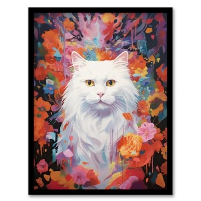 Artery8 Pure White Cat Lover Gift Pet Portrait Colourful Artwork Painting Framed Wall Art Print A4