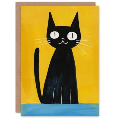 Artery8 Quirky Black Cat Lover Bold Yellow Blue Painting Blank For Him Or Her Art Birthday Card