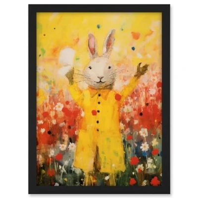 Artery8 Rabbit in a Yellow Rain Mac Oil Painting Bright Floral Meadow Kids Bedroom Nursery Artwork Framed A3 Wall Art Print