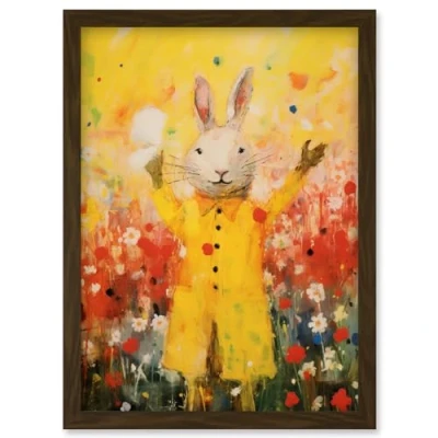 Artery8 Rabbit in a Yellow Rain Mac Oil Painting Bright Floral Meadow Kids Bedroom Nursery Artwork Framed Wall Art Print A4