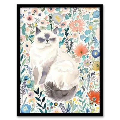 Artery8 Ragdoll Cat Lover Pet and Watercolour Wildflowers Living Room Artwork Framed Wall Art Print A4