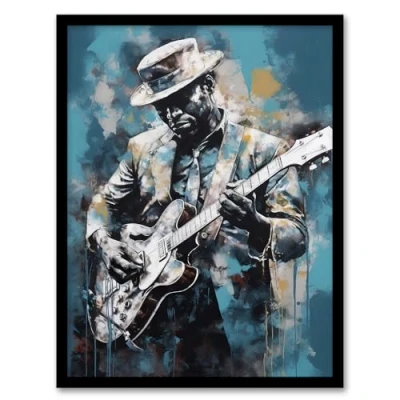 Artery8 Ragtime Blues Watercolour Artwork Musician Playing Electric Guitar Portrait Painting Framed Wall Art Print A4