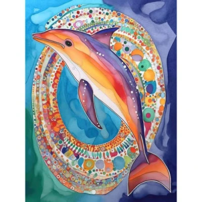 Artery8 Rainbow Dolphin And Pattern Hoop Folk Art Watercolour Painting Extra Large XL Wall Poster Print