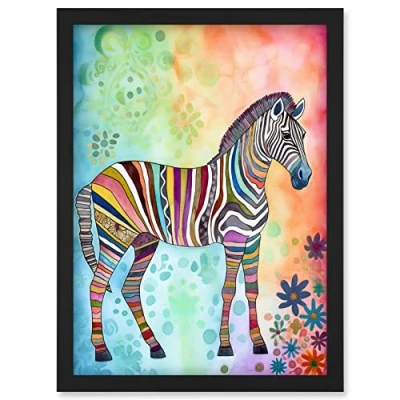 Artery8 Rainbow Floral Zebra Folk Art Artwork Framed Wall Print A4