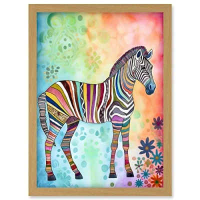Artery8 Rainbow Floral Zebra Folk Art Artwork Framed Wall Print A4