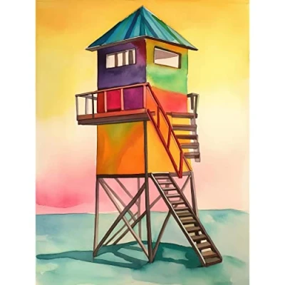 Artery8 Rainbow Lifeguard Tower Folk Art Watercolour Painting Large Wall Poster Print Thick Paper 18X24 Inch