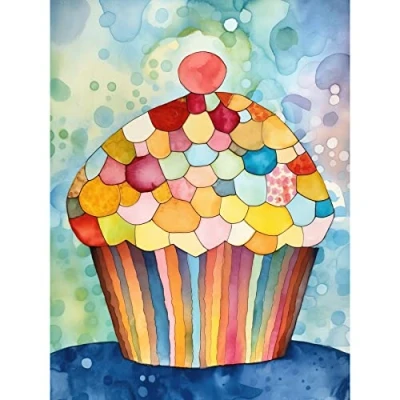 Artery8 Rainbow Pattern Cupcake Folk Art Watercolour Painting Extra Large XL Wall Poster Print