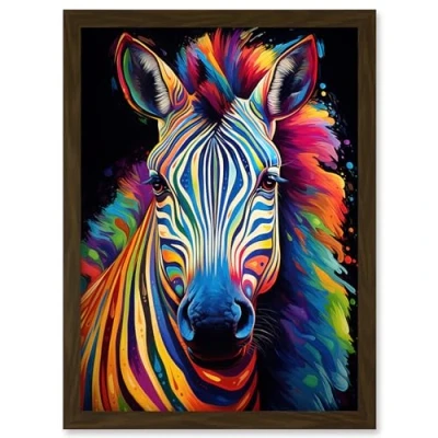 Artery8 Rainbow Striped Zebra Colourful Vibrant Bold Psychedelic Neon Impact Artwork Framed A3 Wall Art Print