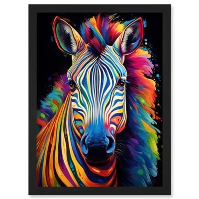 Artery8 Rainbow Striped Zebra Colourful Vibrant Bold Psychedelic Neon Impact Artwork Framed Wall Art Print A4