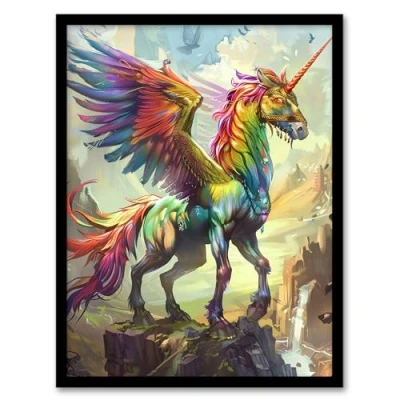 Artery8 Rainbow Warrior Unicorn Fantasy Concept Art Kids Bedroom Nursery Artwork Framed Wall Print A4